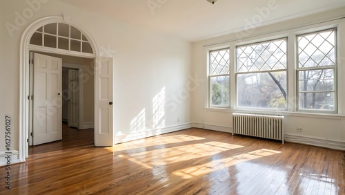 © MONIRANI, Obraz premium Sunlit empty room with arched doorway and large diamond paned window