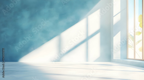 © Home StudioX, Obraz premium Sunlit empty room with blue wall and large window.