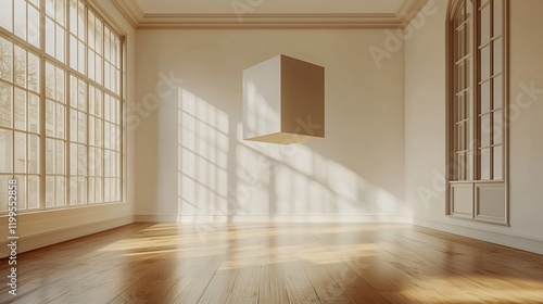 © ABIDZAR ALFAREZ, Obraz premium Sunlit empty room with floating cube.