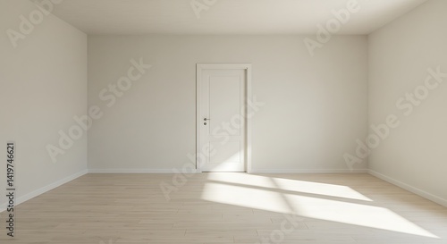 Obraz premium Sunlit empty room with hardwood floors and a single interior door stands ready
