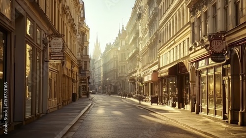 © bulegendut, Fototapeta premium Sunlit European street scene with shops and buildings.