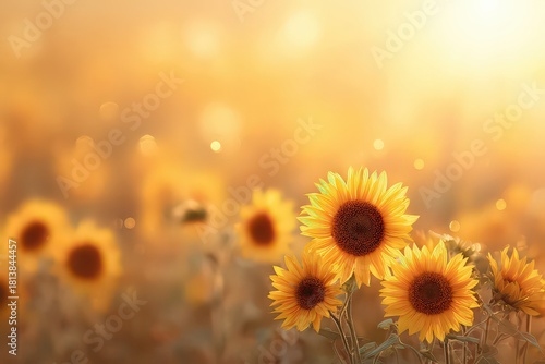 © WawaCreative, Fototapeta premium Sunlit Field Of Sunflowers With Warm Golden Tones And Blurred Background Sunlight And Bokeh