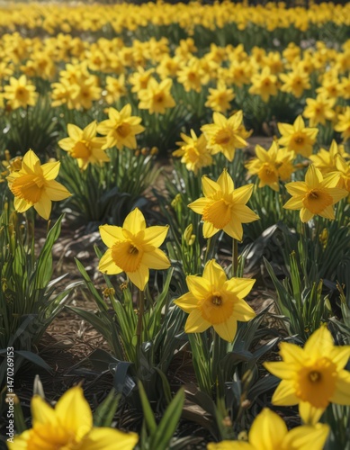 Fototapeta premium Sunlit field of vibrant yellow daffodils in full bloom, petals glistening ,...
