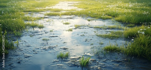 © rashyn, Fototapeta premium Sunlit flooded meadow with lush green grass and wildflowers.