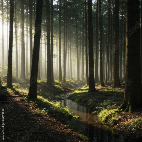 © SweaterWeather, Fototapeta premium Sunlit Foggy Forest Path with Stream