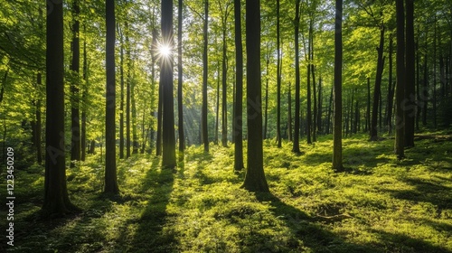 © hello, Fototapeta premium Sunlit Forest: A Serene Green Canopy with Dappled Light