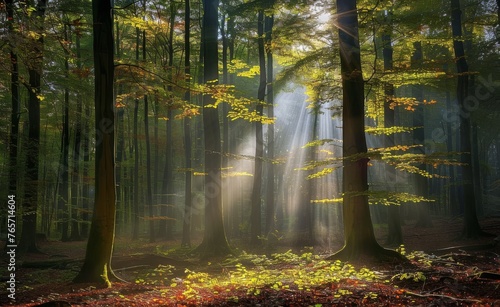 © jiawei, Obraz premium Sunlit Forest Abundant With Trees