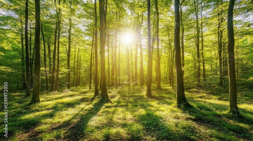 Fototapeta premium Sunlit Forest Canopy: A picturesque forest scene captures sunlight filtering...