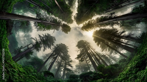 © Mia, Obraz premium Sunlit Forest Canopy with Blue Sky and Rays of Light