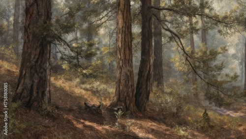 © Nandar, Naklejka premium Sunlit Forest Floor - A Serene Woodland Scene with Towering Trees.