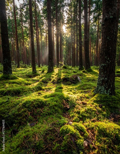 © marni, Obraz premium Sunlit Forest Floor - A Verdant Carpet of Moss and Towering Trees.