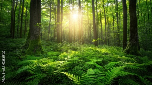 Naklejka premium Sunlit Forest Floor Lush Green Ferns and Trees