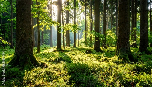 © Nuri, Fototapeta premium Sunlit forest floor, moss, and tall trees