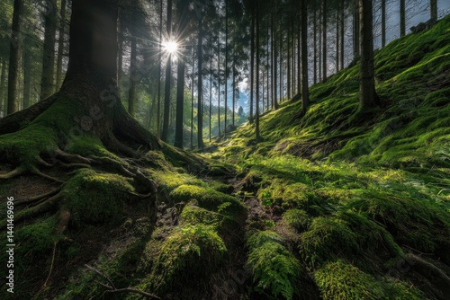 © Muhammad, Fototapeta premium Sunlit Forest Floor, Mossy Roots