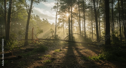 © LiaSyafitri, Fototapeta premium Sunlit forest floor with fallen tree and misty atmosphere