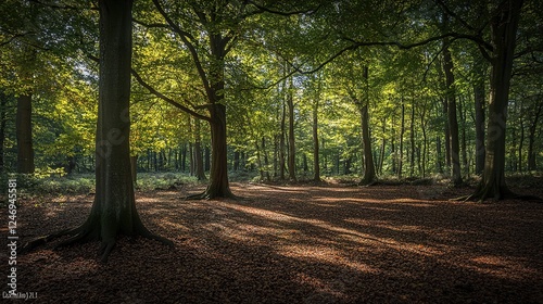 Naklejka premium Sunlit Forest Floor With Tall Trees And Leaf Litter