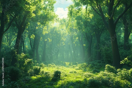 Obraz premium Sunlit Forest Glade with Lush Greenery and Tall Trees Creating a Serene and...