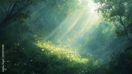 © Vader Stocker, Fototapeta premium Sunlit Forest Glade With Wildflowers Blooming