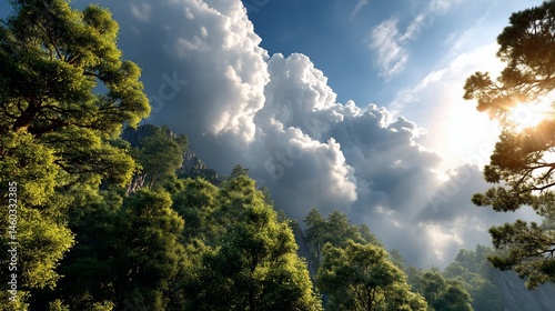 Obraz premium Sunlit forest landscape beneath towering clouds