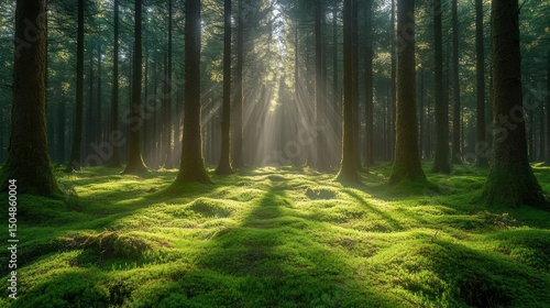 Fototapeta premium Sunlit forest, mossy ground, ethereal light, peaceful scene.
