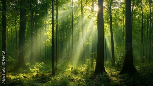 © hello, Obraz premium Sunlit Forest: Mystical Green Canopy with Golden Rays