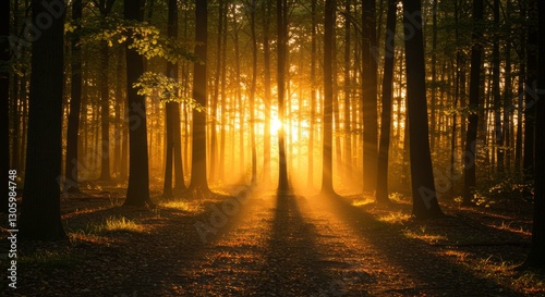 © IPutuToya, Fototapeta premium Sunlit Forest Path: A captivating image capturing the sun's rays piercing through the dense trees of a tranquil forest path, illuminating the scene with a warm, golden glow.