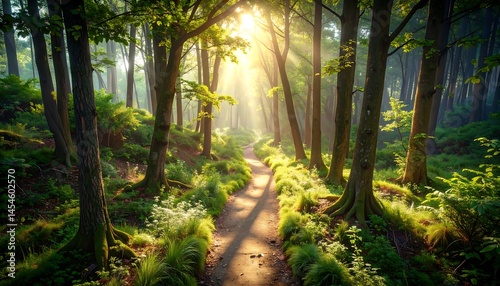 Fototapeta premium Sunlit Forest Path: A Misty Morning Walk