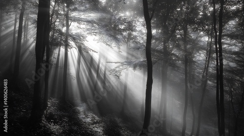 © nuyirdna, Naklejka premium Sunlit Forest Path: A Monochromatic Masterpiece