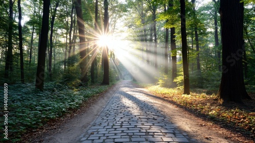 Obraz premium Sunlit Forest Path - A paved path winds through a sun-drenched forest, symbolizing serenity, journey, nature, hope, and new beginnings