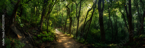 Obraz premium Sunlit Forest Path: A Serene Exploration Through Verdant Woods