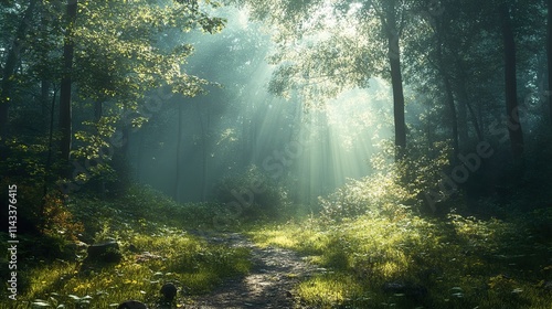 © Infinity, Obraz premium Sunlit Forest Path: A Serene Nature Escape