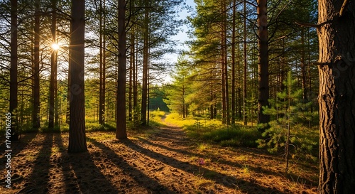 © mila, Obraz premium Sunlit Forest Path - A Serene Woodland Scene.