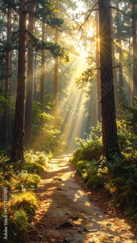 © Design Adelsa, Fototapeta premium Sunlit Forest Path - A Serene Woodland Scene.