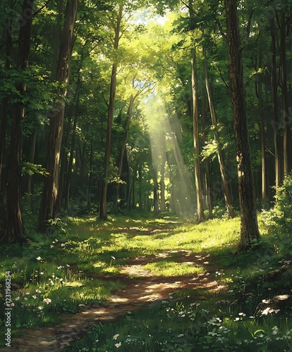 Obraz premium Sunlit Forest Path: A Serene Woodland Trail Bathed in Golden Light