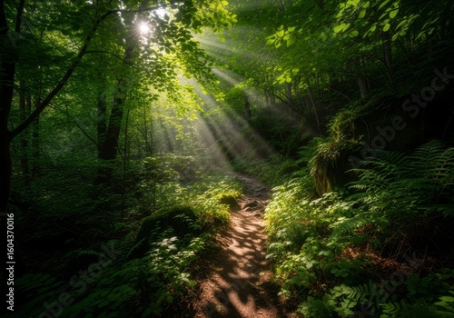 Obraz premium Sunlit Forest Path - A sunlit path winds through a lush green forest, dappled...
