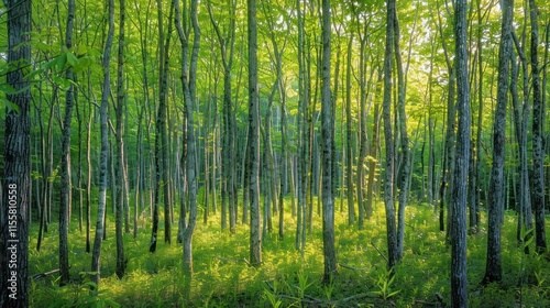 Naklejka premium Sunlit Forest Path: A Tranquil Escape into Nature's Embrace