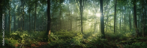 © Riz, Obraz premium Sunlit Forest Path A Tranquil Nature Scene