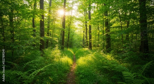 Fototapeta premium Sunlit Forest Path - A tranquil path winds through a lush green forest bathed in sunlight. Perfect for nature, tranquility, and serenity themes