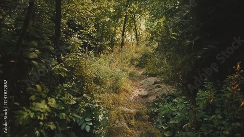 Fototapeta premium Sunlit Forest Path: A Tranquil Woodland Walk