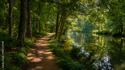 © raseldesigner93, Obraz premium Sunlit forest path alongside a calm river reflecting green trees