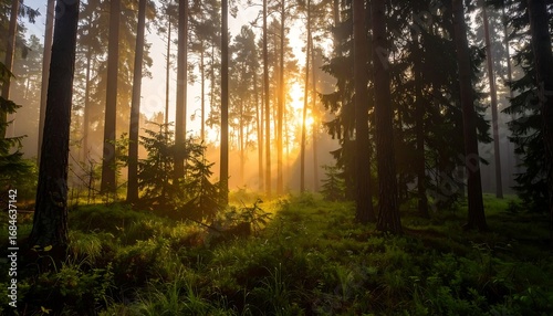 © Arif, Obraz premium Sunlit forest path at dawn, misty scene