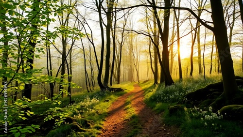 © goslim, Obraz premium Sunlit Forest Path at Dawn with Lush Greenery