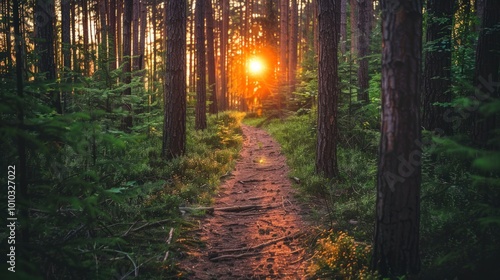 © Mahavira Osa, Fototapeta premium Sunlit Forest Path at Sunset