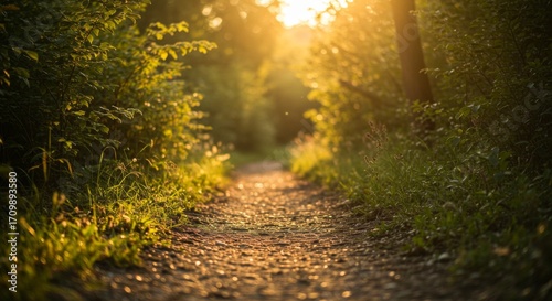 © AleniaFlow, Obraz premium Sunlit Forest Path at Sunset