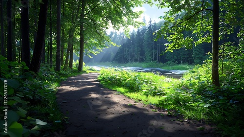 Obraz premium Sunlit Forest Path Beside a Tranquil River