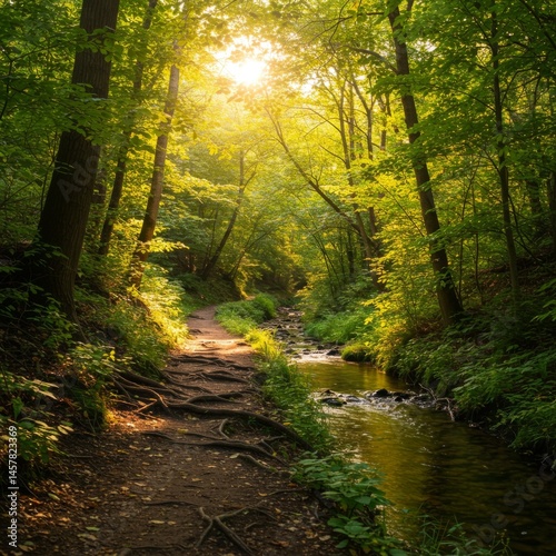 © DanadyaksaDen, Obraz premium Sunlit Forest Path Beside a Tranquil Stream