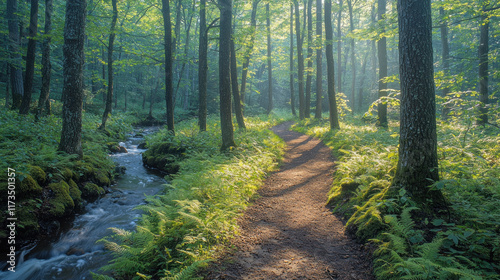 Obraz premium Sunlit forest path by stream, misty morning