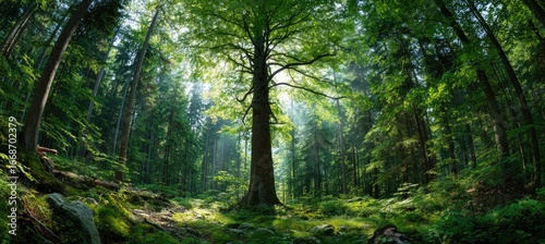 © Zan, Obraz premium Sunlit forest path, centered on a large tree, surrounded by lush greenery and mossy rocks