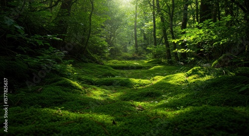 © Muhammad, Fototapeta premium Sunlit forest path covered in thick green moss with dense trees in the background