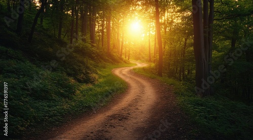 © Ananda, Naklejka premium Sunlit forest path curves through trees (1)